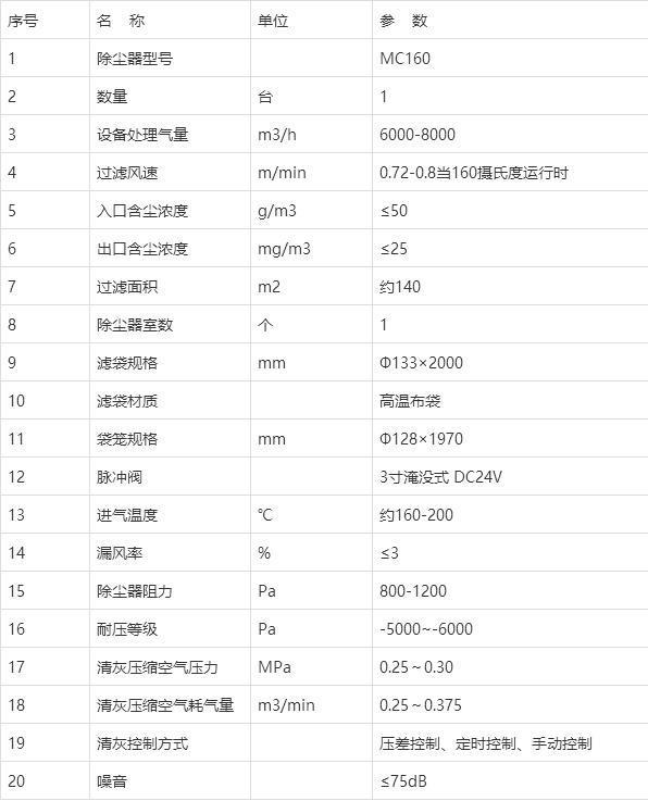 2吨锅炉布袋除尘器技术性能参数表